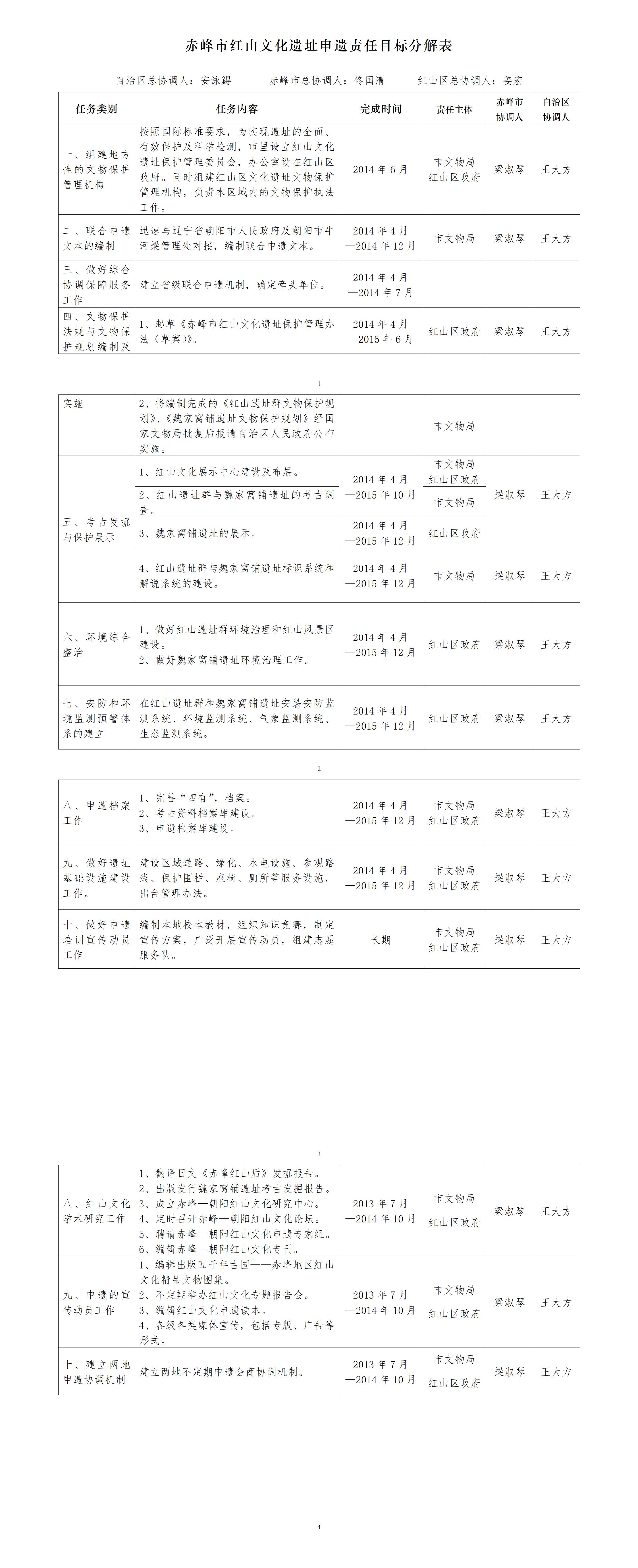 红山文化遗址申报世界文化遗产各项工作任务明细表