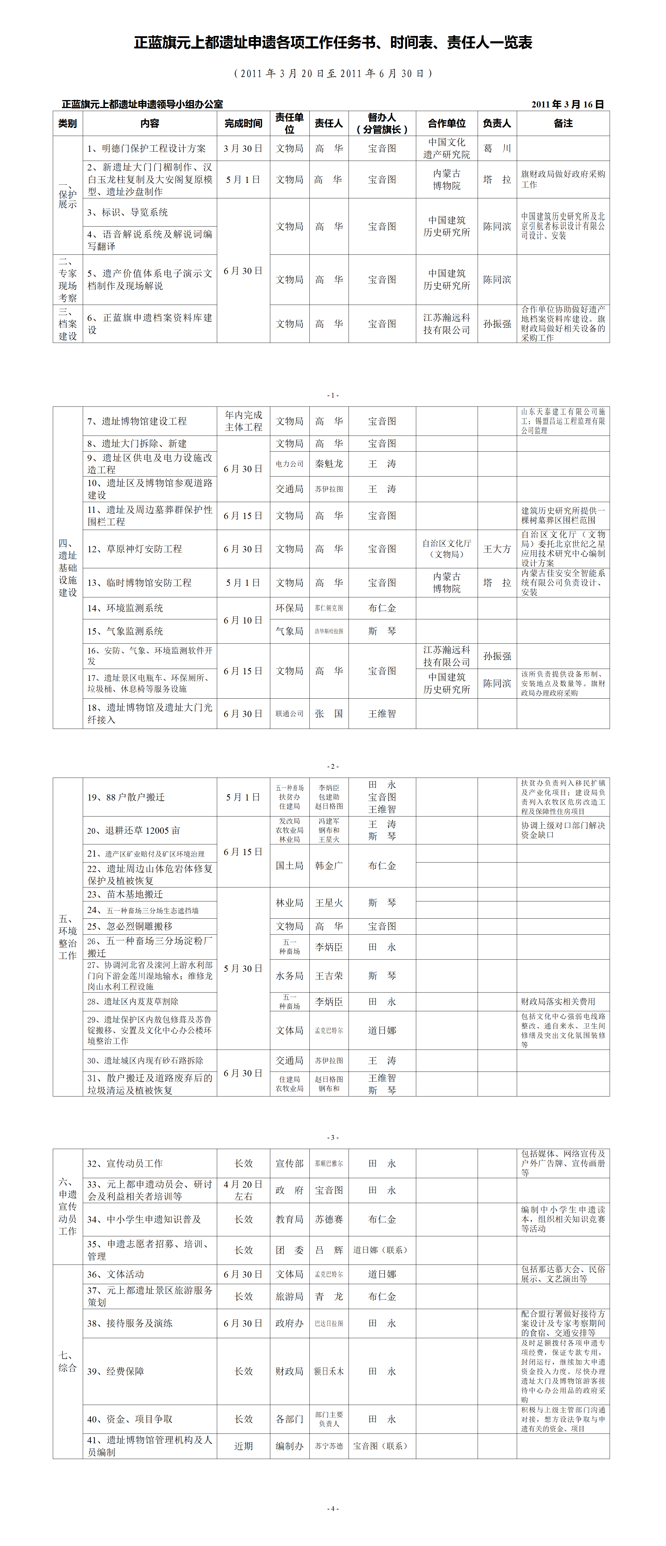 正蓝旗元上都遗址申遗各项工作任务书、时间表、责任人一览表