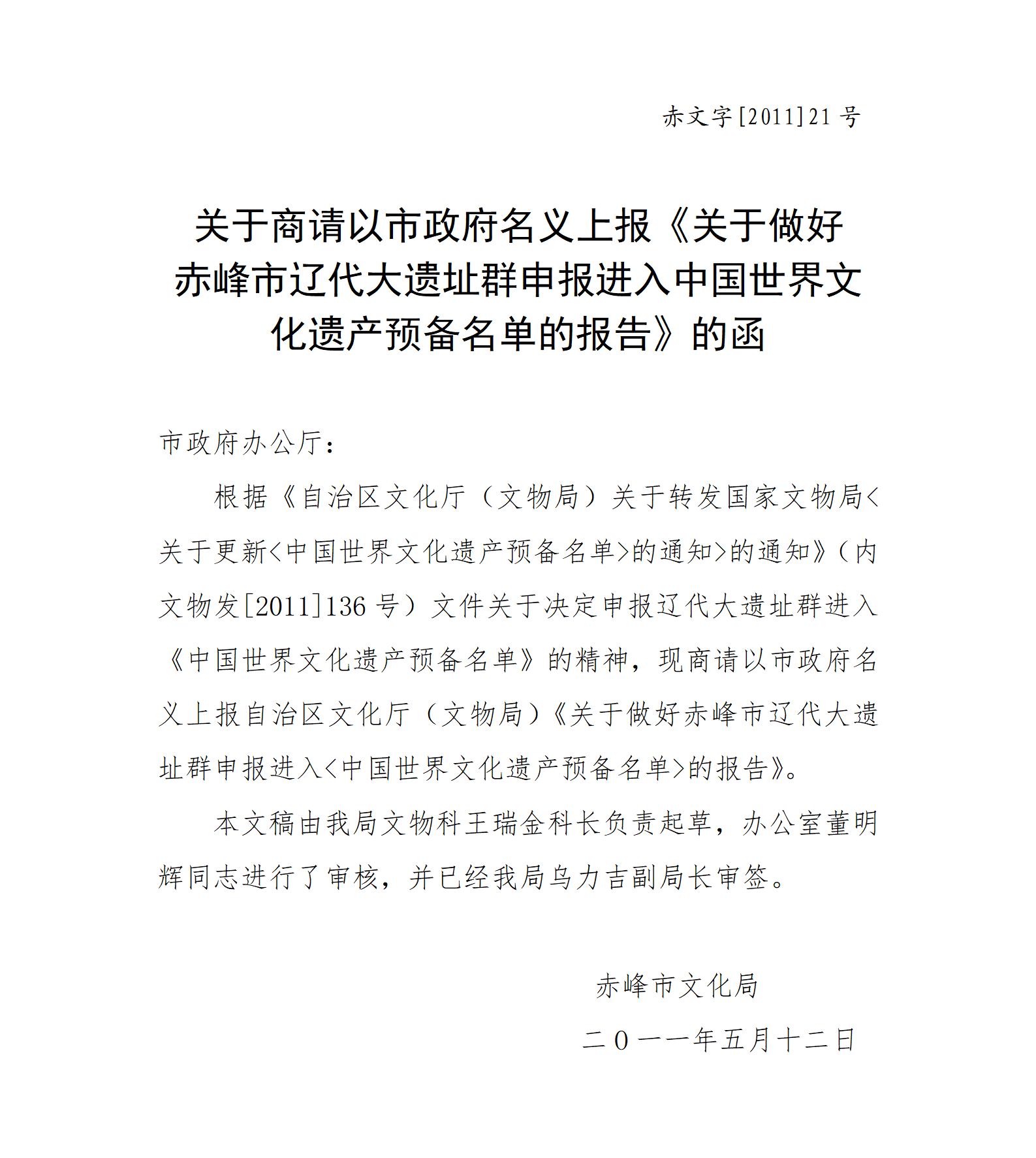 根据《自治区文化厅(文物局)关于转发国家文物局<关于更新<中国世界文化遗产预备名单>的通知>的通知》(内文物发[2011]136号)中关于决定申报辽代大遗址群进入预备名单的精神,建议市政府成立专项工作领...
