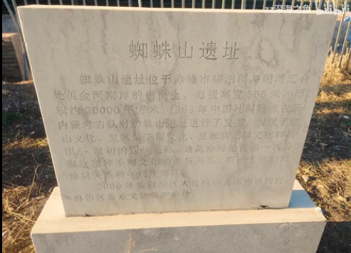 位于赤峰市红山区头道街兴隆街北口,面积约2万平方米。发现有红山文化、夏家店下层文化、夏家店上层文化和战国至秦汉时期文化遗存,这是西辽河地区第一次发掘这四种不同文化的叠压关系,明确了它们的地层关系和年代序列。红山文化层在最下面,只分布于遗址西部;夏家店下层文化的堆积层几乎遍布整个遗址,是遗址最丰富的堆积层;夏家店上层文化很少有能连成大片的堆积层;战国至汉的文化层主要分布于遗址中部。蜘蛛山遗址有着清晰的时代发展脉络,其中发现夏家店下层文化半地穴房址4座、窑穴11座;夏家店上层文化方形半地穴房址2座、窑穴13座。蜘蛛山遗址是研究赤峰古代历史的重要文化遗存。